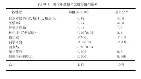 常用的測(cè)量單位是倫琴,戈瑞(Gy)和希沃特(Sv).倫琴(R)是空氣中x或γ電離輻射的計(jì)量單位,戈瑞是被各組織或物質(zhì)吸收的能量計(jì)量單位,它可應(yīng)用于各類輻射.R和厘戈瑞(cGy)基本上是相等的.在說(shuō)明生物學(xué)效應(yīng)時(shí),Sv與經(jīng)質(zhì)量因子校正的Gy相等.因?yàn)閷?duì)一定量的能量而言,不同類型的輻射可產(chǎn)生不同的生物學(xué)效應(yīng);例如,中子有較大的效應(yīng).對(duì)X和γ輻射,Sv與Gy相等.在現(xiàn)代術(shù)語(yǔ)中Gy和Sv已替代拉德(rad)和雷姆(rem),Gy=100rad,Sv=100rem.在非專業(yè)刊物中常常將輻射分為低水平輻射(0.2~0.3Gy)和高水平輻射(>0.3Gy).而醫(yī)學(xué)劑量一般為<0.05Gy,而且常常<0.01Gy.地球及其大氣的本底放射活性水平很低,而不能測(cè)知其效應(yīng)(表278-1).